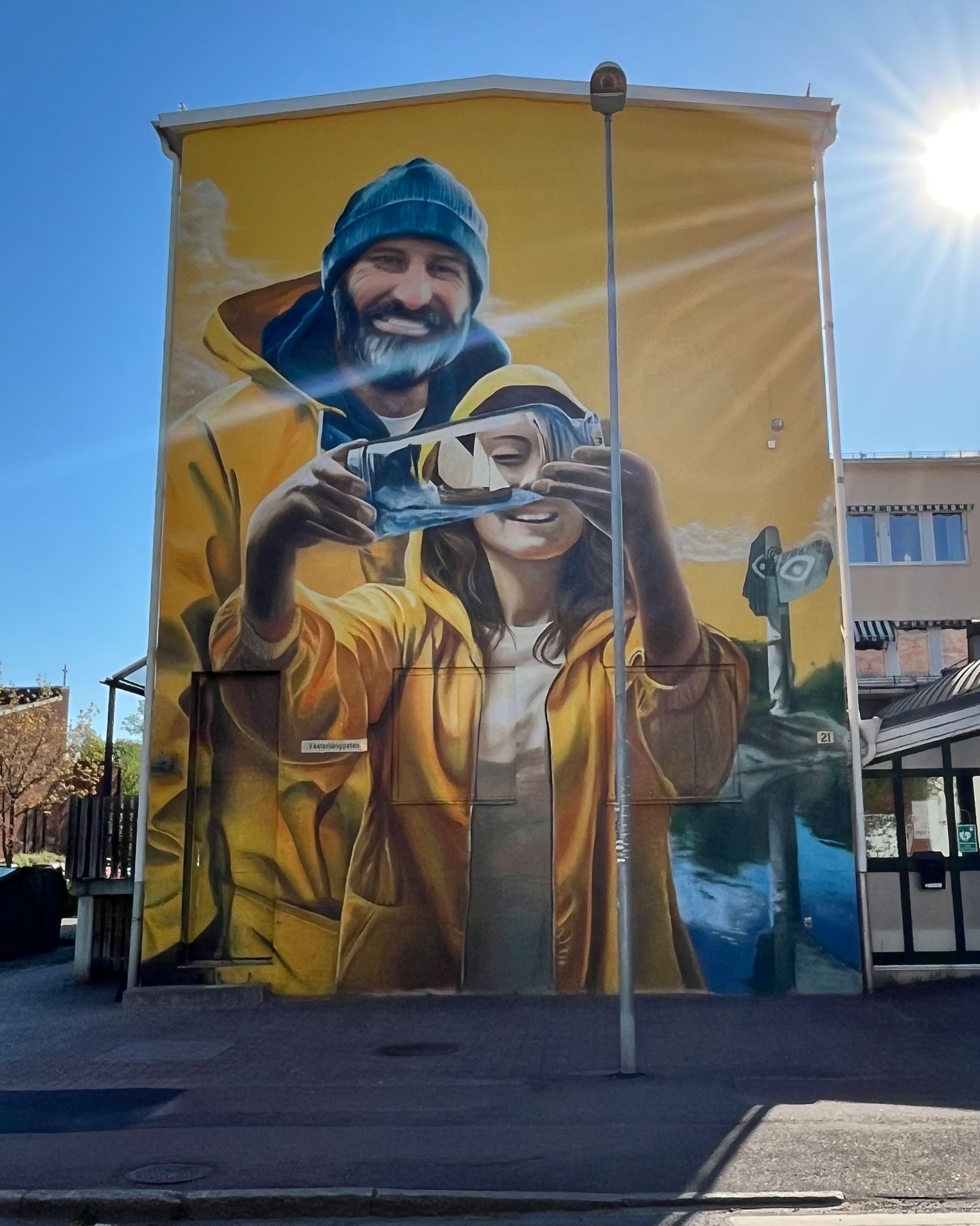 Själva figurerna skapas av lackerad aluminiumplåt som samspelar med hallens fasad i plåt. Genom att monteras med en liten distans från fasaden blir konstverket tydligt framträdande och dessutom belyst bakifrån under dygnets mörka timmar. Tillsammans med LED-slingan kommer detta både framhäva figurernas konturer och ge ett varm sken på hallens fasad.