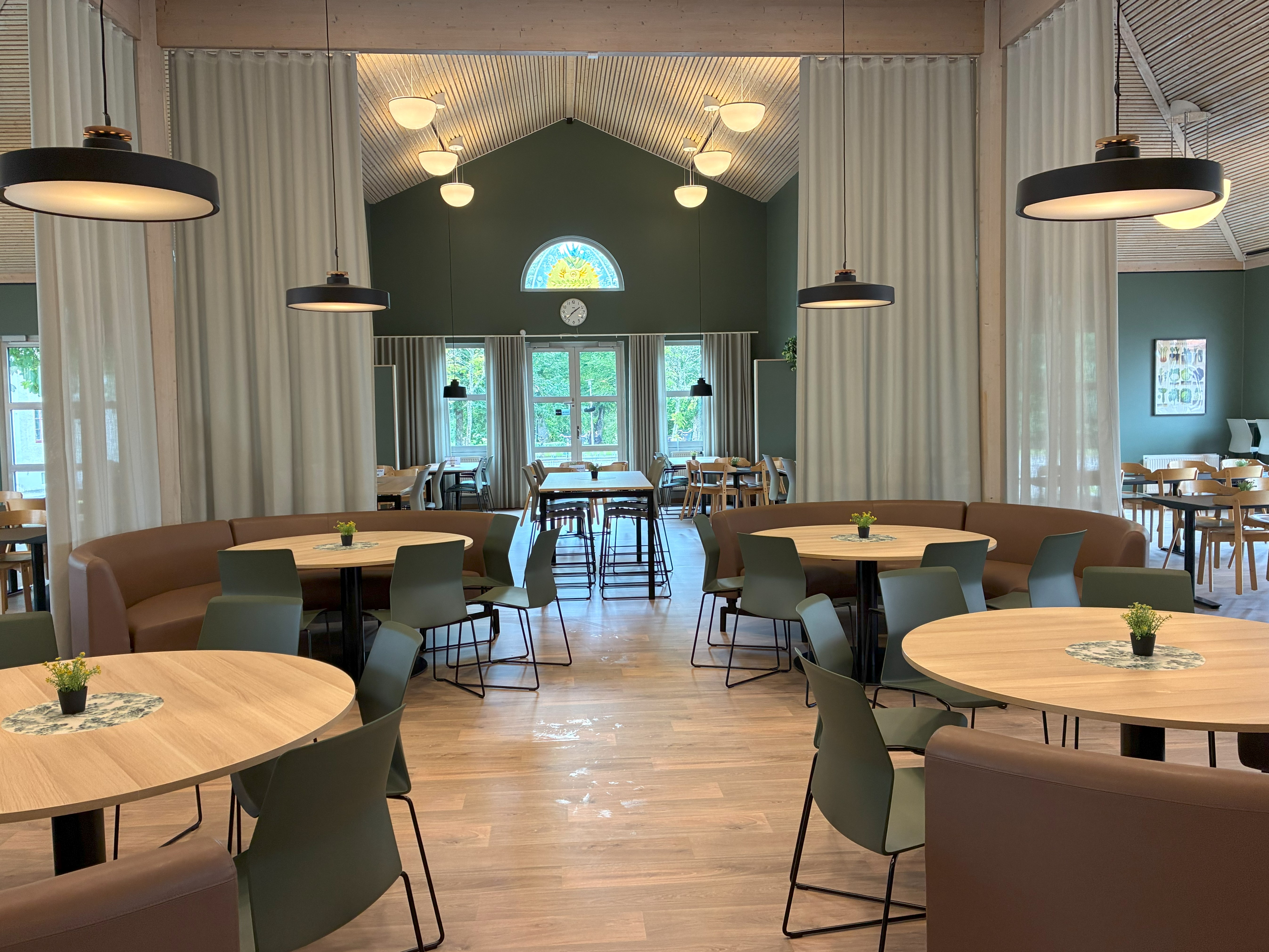 Elevernas tidigare bildcollage och samtal under workshopsen har satt tydliga spår i inredningen. Runda bord, olika sittmiljöer och delvis nya stolar gör att eleverna både kan äta och umgås på ett bekvämt sätt. Ljusinsläppet har förstärkts, ljudmiljön är dämpad och de naturnära färgtonerna ger som eleverna säger, en känsla av restaurang på riktigt.
