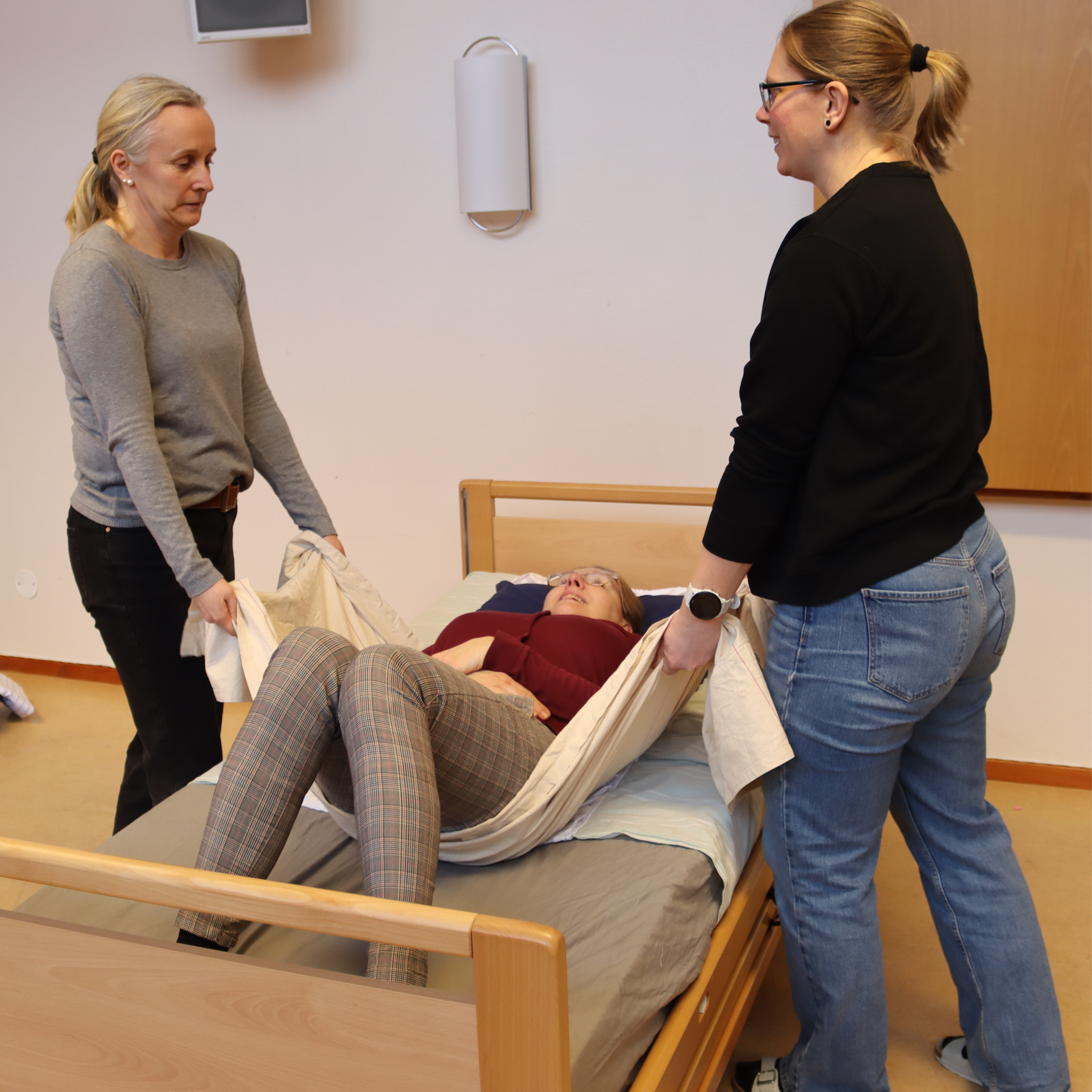 Under utbildningen deltog personalen i flera praktiska övningar. De fick bland annat prova att bli matade av en kollega, ta sig fram i rullstol, gå i trappor med begränsad andning och uppleva hur det är att bli förflyttad i en säng.
